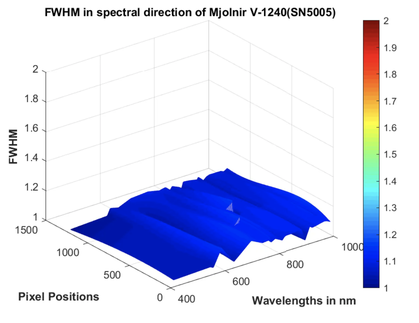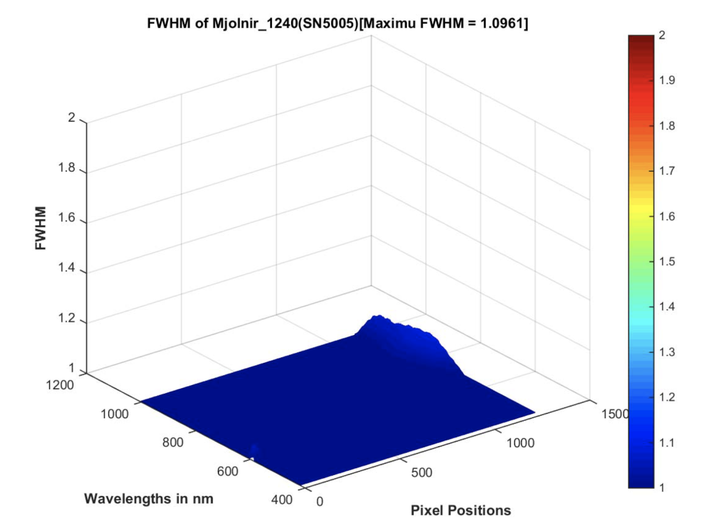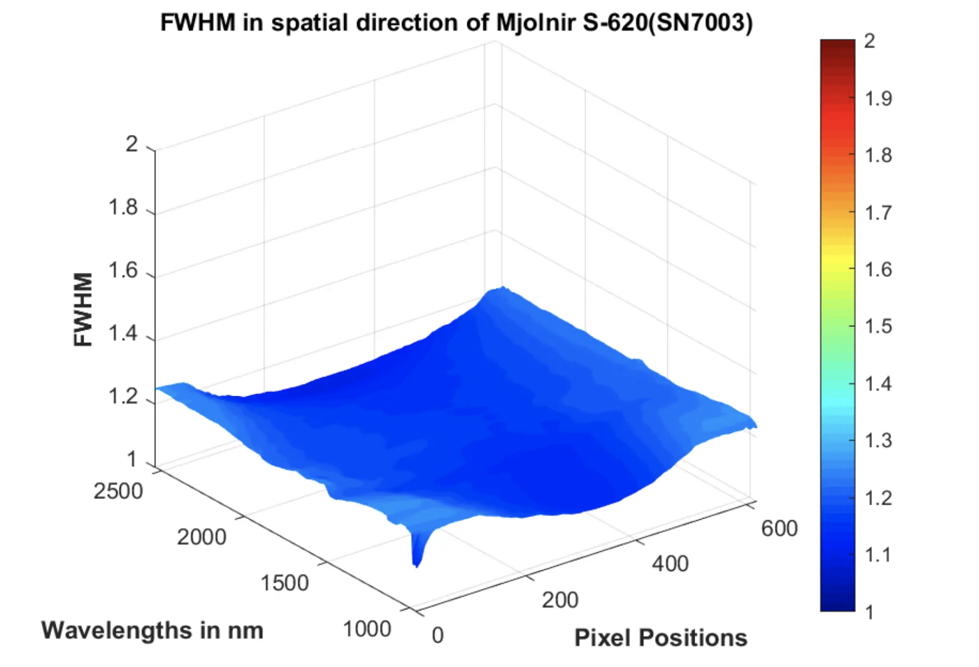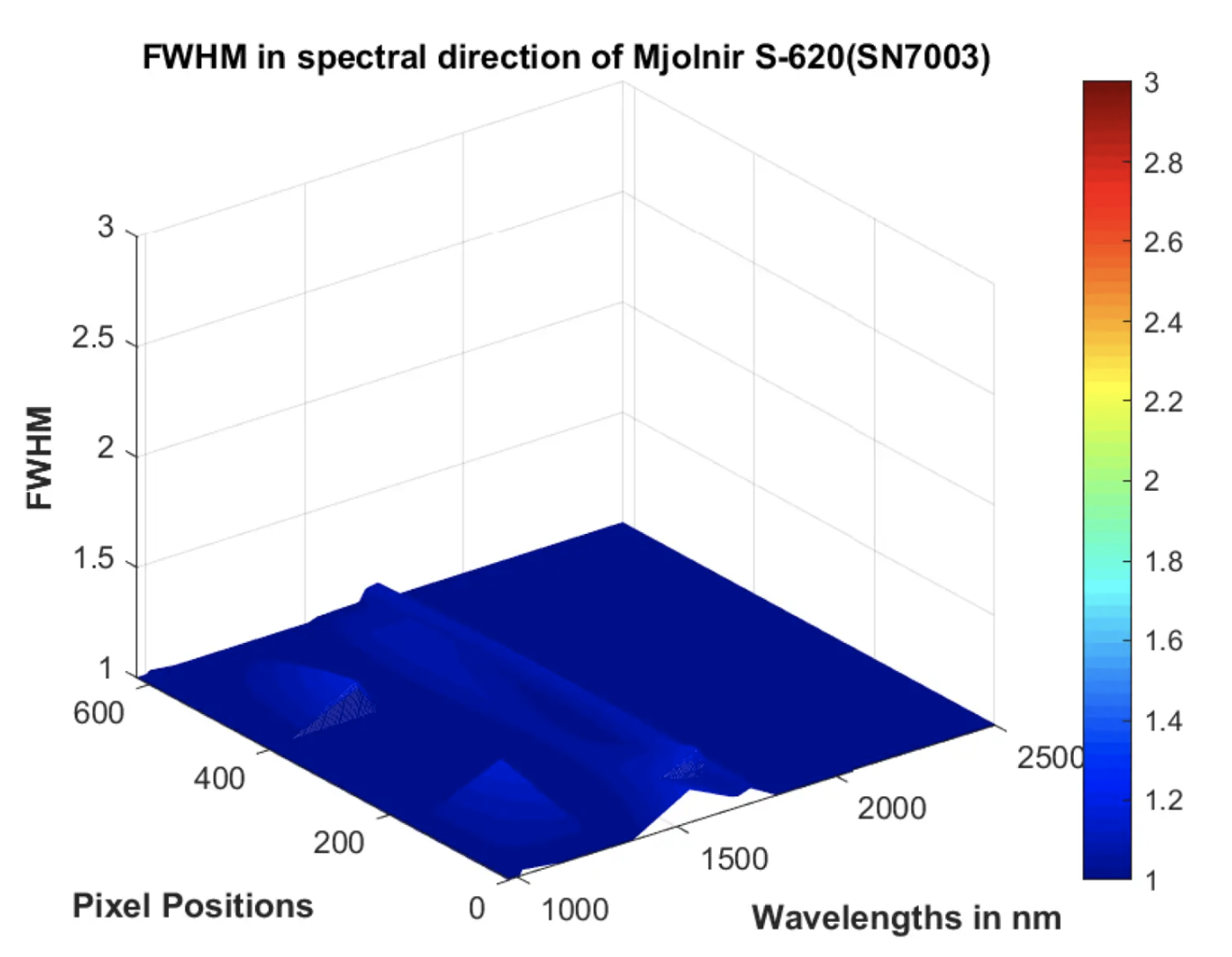 SWIR detectors are usually very expensive and have a limited amount of pixel relative to the VNIR range. This is one of the reasons why its especially important to gather as much information as possible per pixel in this spectral range. Below we show the measured FWHM of the point spread function across the track and for all wavelengths.