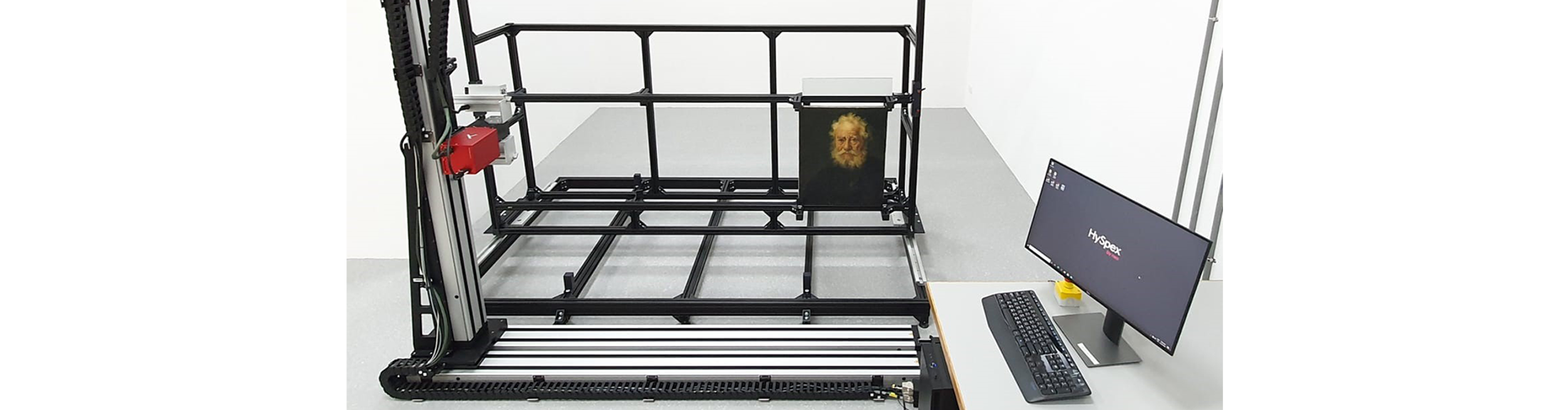 The system used by C2RMF is based on NEO’s well proven HySpex VNIR-1600 combined with a large (100cm*150cm) horizontal and vertical scanning stage, a fiber optic light source and a high resolution line scan camera yielding a scene pixel size of approximately 12μm at 30cm object distance. The setup is compatible with all HySpex cameras and can be delivered in both multi- and single-camera configurations to cover the desired spectral range.