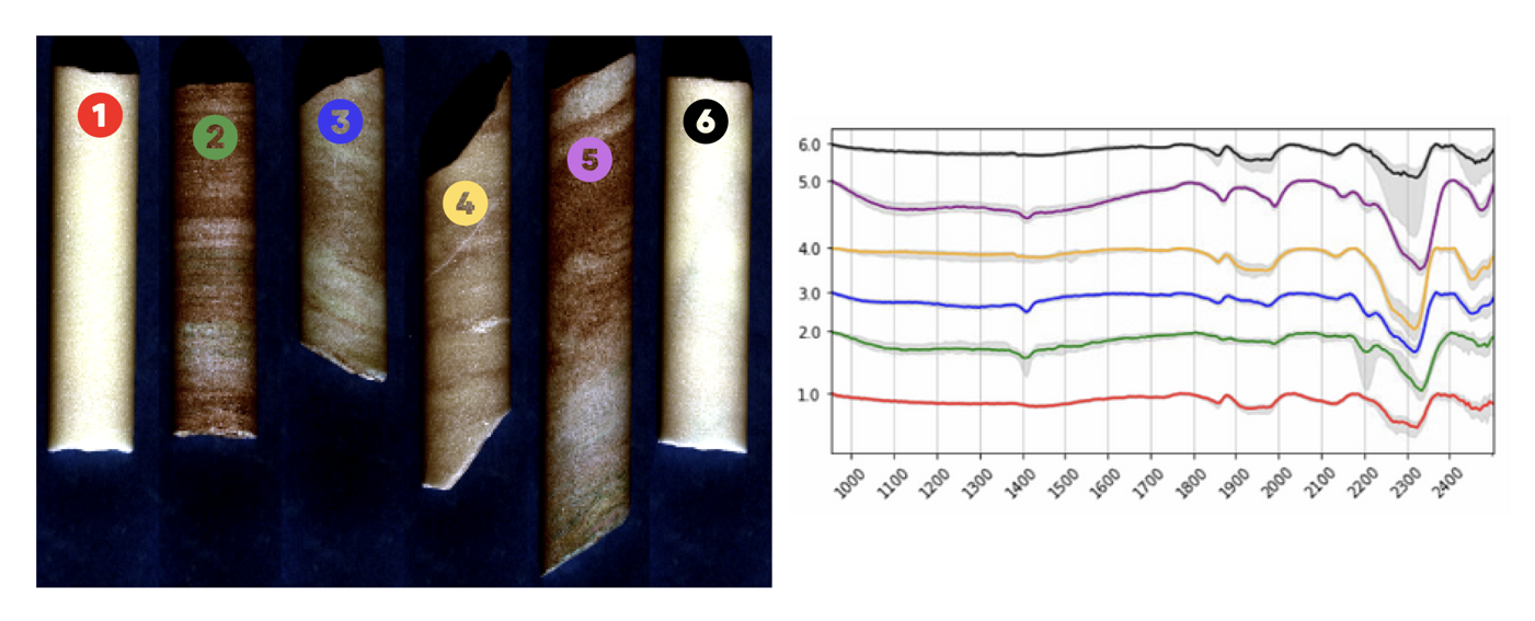 Figure 1 shows the different spectra for six of the provided drill cores. Mineralogic changes within each core are evidenced by the changes in the observed spectral features, as well as the variance of spectral features visible through the grey envelope. In Figure 2, the wavelength position of the absorption feature is modelled [2]. The strongest absorption feature position and depth is plotted. The dolomite feature minimum at around 2320nm is represented in orange colors, calcite with a minimum around 2340nm is shown in red, and clay-type mineralization around 2200nm is shown in green.