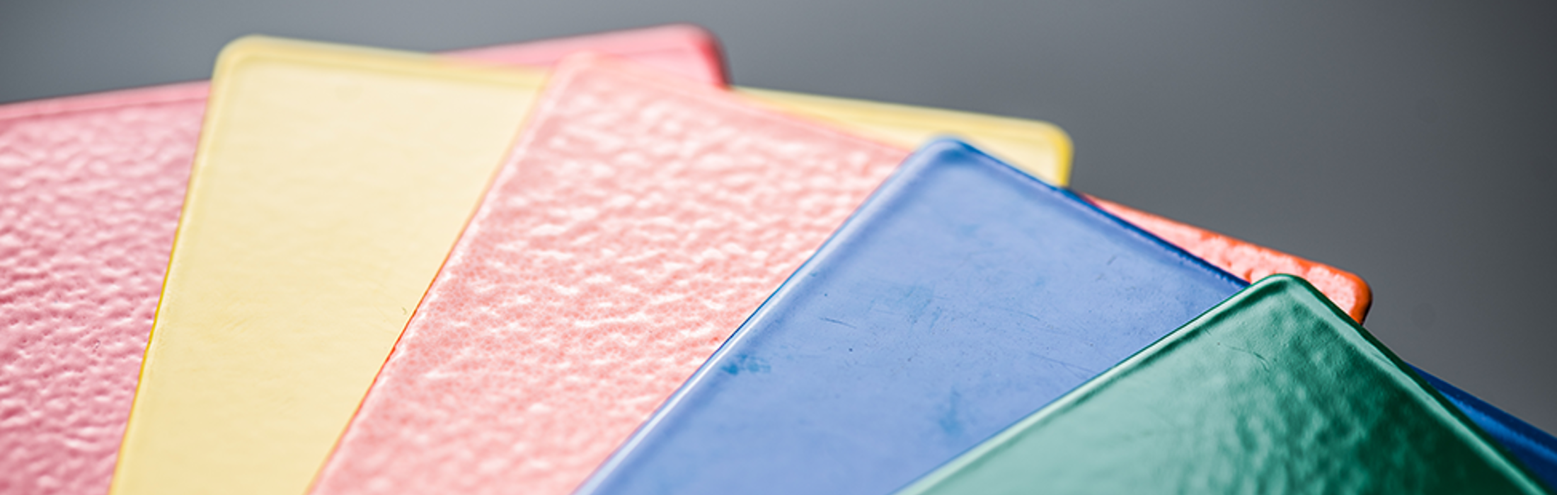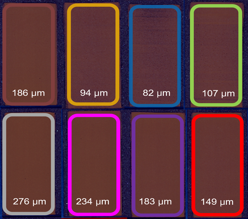 In this study we investigate a set of 8 painted panels with different dry film thicknesses (DFT) The goal is to use supervised machine learning algorithms on the spectroscopic information of the painted panels to predict thickness on new samples. The coated panels are shown in Figure 1, color coded and labeled with a reference DFT value. These values were measured in one location only and does not take intra-sample thickness variation and inhomogeneity into account.