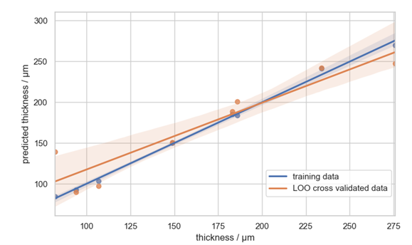 The dataset is relatively small for creating a regression model so Leave-One-Out Cross Validation (LOOCV) is applied to avoid overfitting the data. With LOOCV we train the model with 7 out of the 8 samples, test it on the left-out sample and repeat the procedure for all permutations. Predicted vs. reference value is plotted in Figure 3. The R2 regression score when including all samples in the model is above 0.99 while for the cross validated model the regression score is 0.86. This indicates a very good model fit, especially considering the small dataset and the point measured reference values.