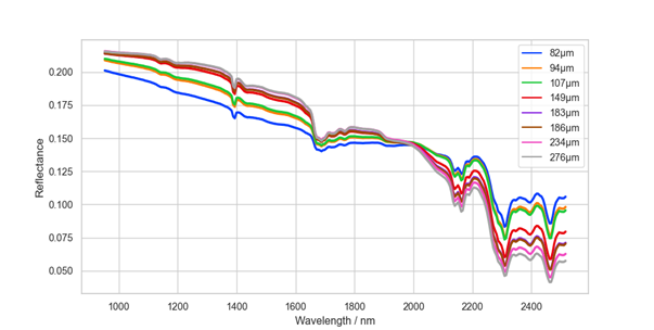 Starting the hyperspectral measurement, light reflecting off the surface of the panels is captured by the HySpex SWIR-384 hyperspectral camera, recording the complete spectral information in the wavelength region of 930-2500nm for every single pixel within the scene. To train the model we are only interested in the mean spectral properties of each panel, which are shown in Figure 2. While we can hardly see any differences between the panels with the blank eye, the spectral response detected by the camera clearly shows a shift in reflected intensity along large parts of the spectrum. This distinctive information can be used to train a PLS regression model. Once a model is made it can then be used to predict DFT values of each pixel in new images allowing us to either calculate an average sample value or to inspect thickness variation within each sample.This distinctive information can be used to train a PLS regression model. Once a model is made it can then be used to predict DFT values of each pixel in new images allowing us to either calculate an average sample value or to inspect thickness variation within each sample.