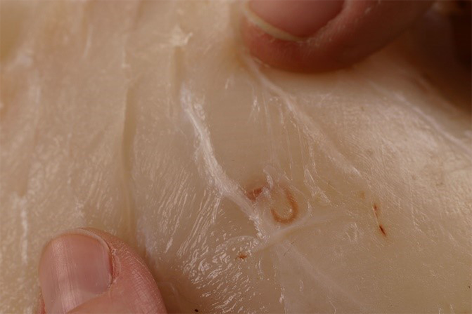 Manual inspection of cod fillets. Parasitic nematodes can be found embedded in cod tissue. Photo: Nofima Tromsø