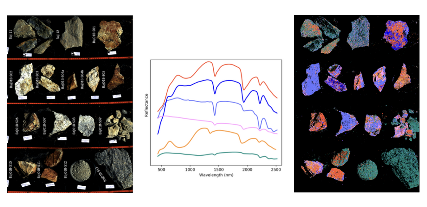 Figure 1: Sample-based spectral library. The 14 samples (left) collected on-site were analysed and characterised in the laboratory using both hyperspectral and traditional means. The samples spectra were then grouped in clusters according to their geochemically dominant features and the hand sampling (center) [5]. The spectral library-based classification (right) shows that the spectral cluster classes can be used to identify the samples on a sample level, but that the samples are not homogeneous and show a more differentiated picture on a pixel-level classification. The library was later used to identify the lithologies on the mine face.