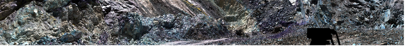 The mine face scan of “position 1” (Figure 2) is located in the west of the open pit shows a clear distinction between the Li-pegmatite toward the East, here classified by its dominant clay and chlorite content. The Li-pegmatitic vein is bound towards the West, seen in Figure 4 by the changes in color from dark metasediments in the West and the lighter pegmatite vein in the center of the open pit. The color infrared of the SWIR data also shows different spectrally similar regions within the Li-pegmatite (blue areas). The analysis of “position 2” (Figure 3) is located within the area of the pegmatitic vein. Larger areas of the imagery are classified as kaolinite dominated, towards the centre and the more enriched zone in the South, areas are mapped as chloritic (green) and iron dominated (red). The two scanning positions within the open pit are shown in Figure 4.