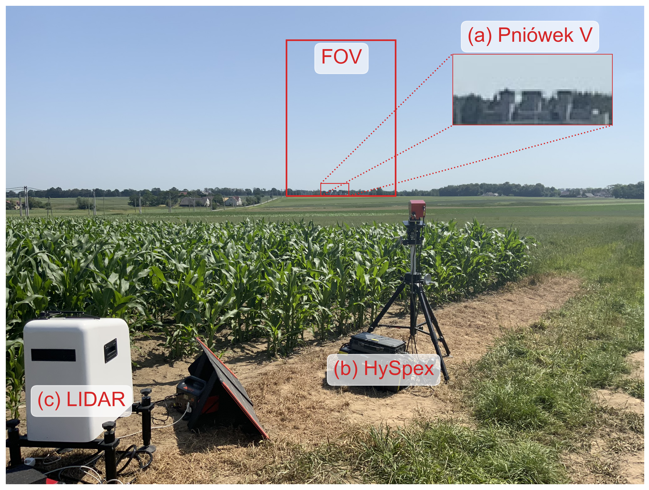 The field instrumentation comprises a HySpex SWIR-384 hyperspectral camera and a Windranger 200 wind-lidar. The camera is mounted on a rotation stage, allowing for horizontal scanning of the target area. It captures skylight from a shallow elevation angle recording the SWIR spectrum between in the shortwave infrared (SWIR, 950 nm, and 2500 nm) with a sampling distance of 5.45 nm. Simultaneously, the Windranger measures wind direction and velocity at various heights, see Figure 1 for the field setup. With a spatial resolution of approximately 0.8 m x 0.8 m, a single HySpex scan takes around 60 seconds. Over a span of four days, scans were collected continuously at roughly 1-minute intervals, supplementing the images with wind data, temperature, pressure, and other meteorological measurements.