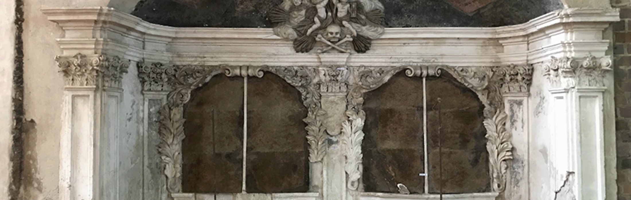 The different elements of the burial site are shown in Figure 1. It contains inscription panels framed in fine stucco decoration. The sides are lined by pilasters with Corinthian capitals and the parapet zone below the panels is decorated with stucco motifs of transience such as skulls and bones. Above the pilasters sits a stuccoed crowning group with angels, hourglass and a skull, topped by a calotte with an 18th century mural painting depicting biblical scenes.
