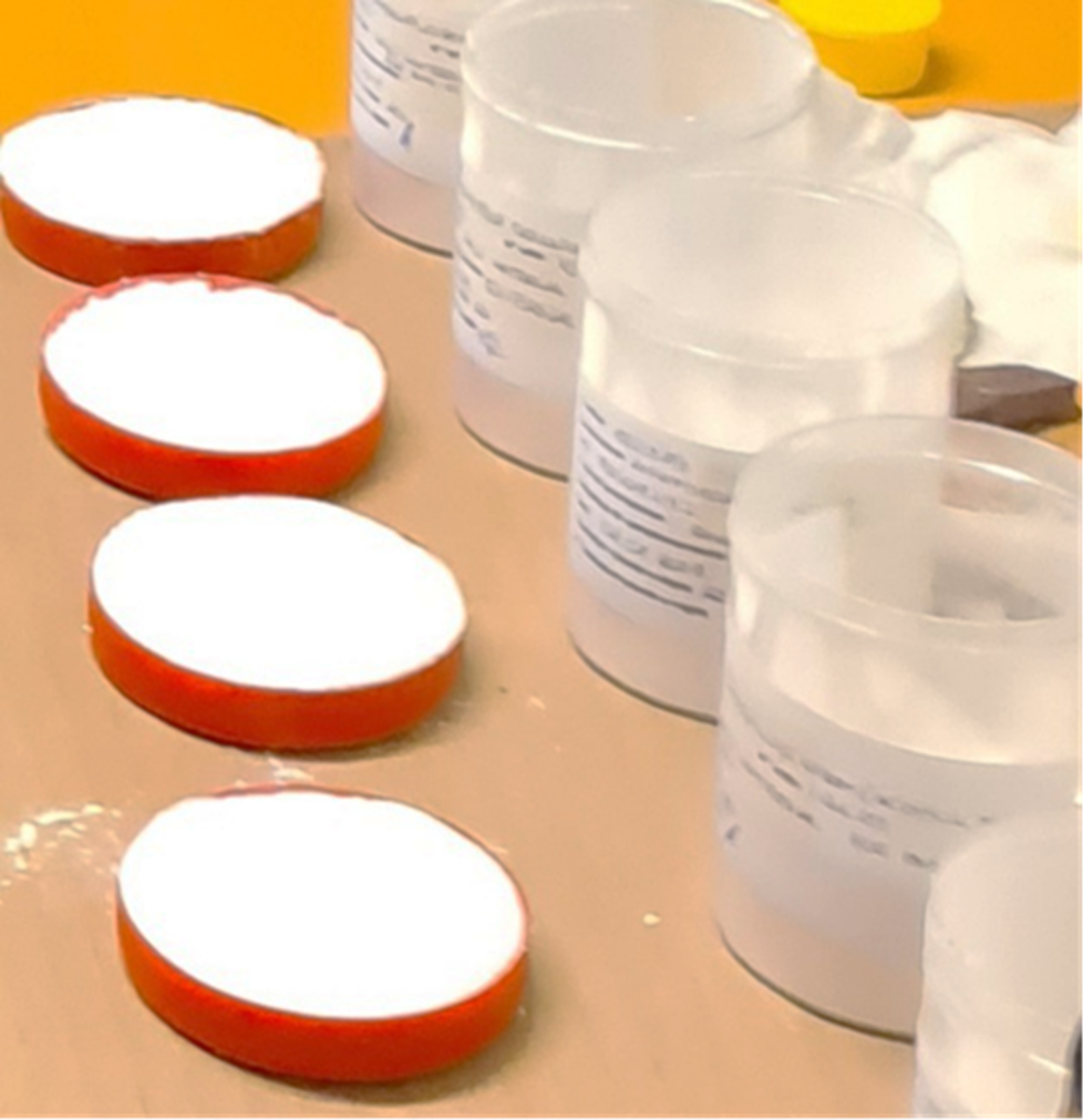 | Spatial distribution of the different chemical substances in the pure samples and in the two unknown mixes. The calculation is based on spectral unmixing applied to each pixel in the image. The color-coding gives an estimation of the amount of each substance on a given sample, and the amount of API in the mixes. |