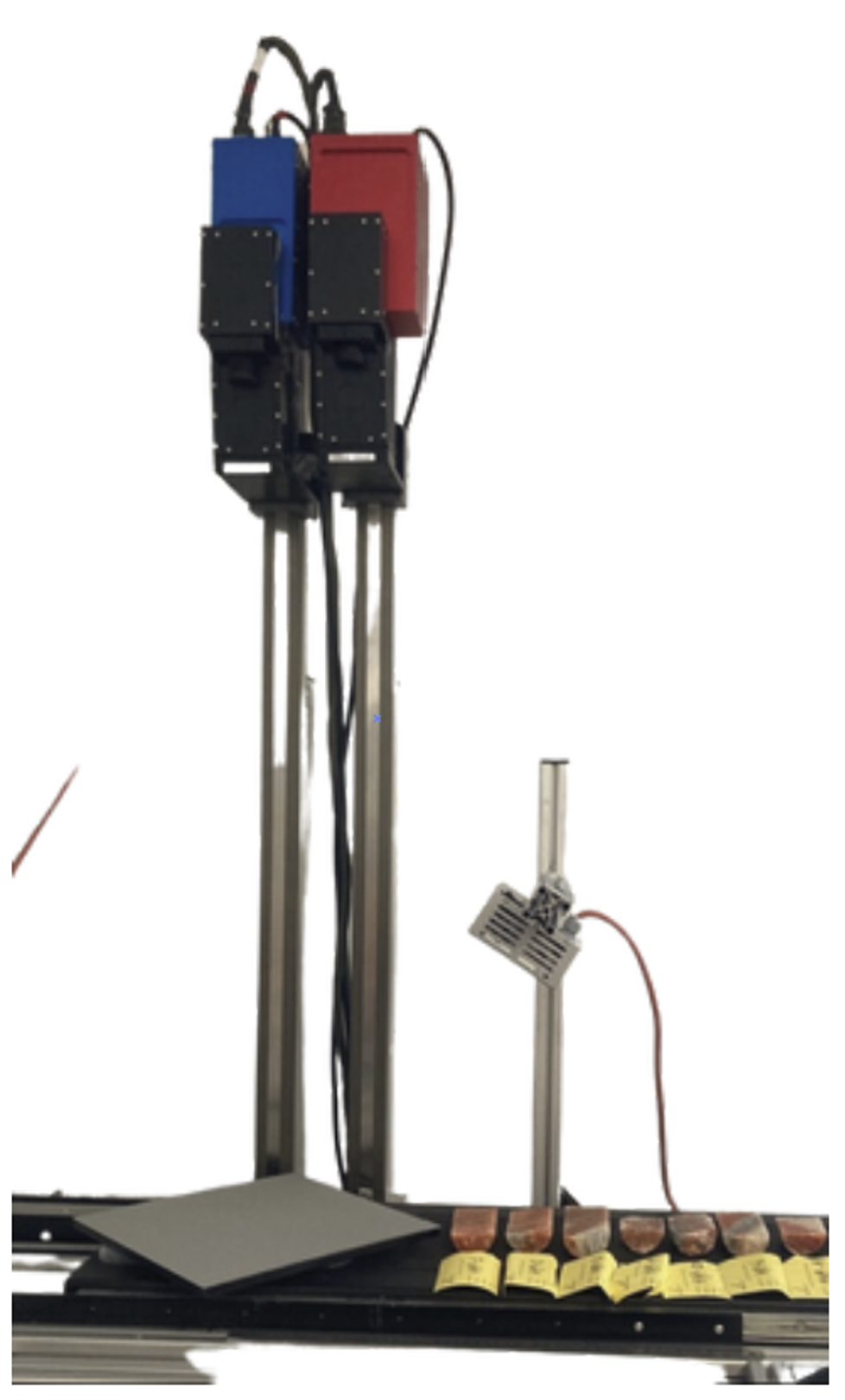 For this test, half-core samples were scanned using the visible-to-near infrared (VNIR) and shortwave infrared (SWIR) spectral ranges. The imaging was done from a scanning distance of 100 cm, resulting in 0.16 mm and 0.77 mm pixels in the VNIR and SWIR, respectively. Figure 1 shows the scanning setup with the HySpex classic VNIR (blue) and SWIR (red) cameras mounted side by side. The data is corrected to absolute reflectance using a reference grey panel, also visible in the image.