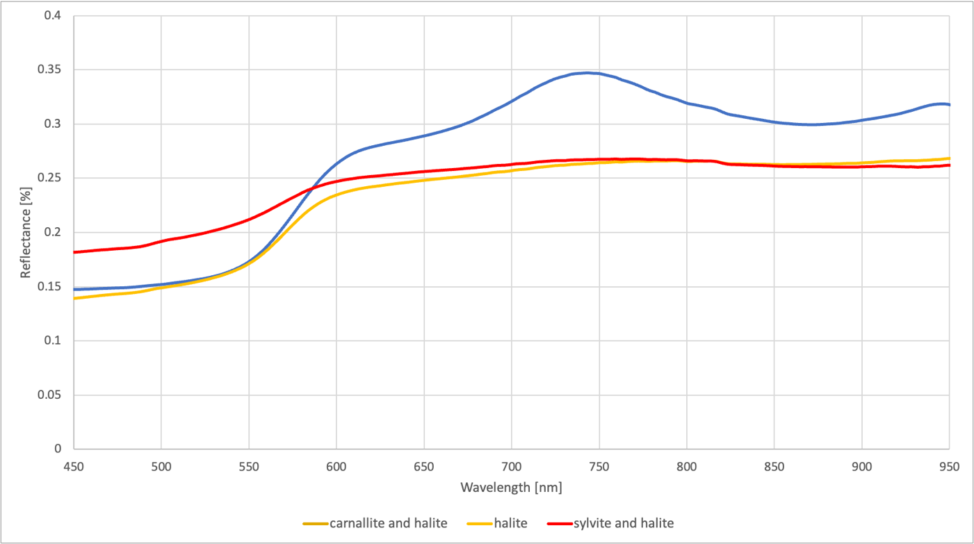 As the KCl is linked to the sylvinite, a classification model was set up to define the areas occupied by the sylvite-halite lithology. The spectra of sylvite-halite show a sufficient though subtle spectral difference compared to carnallite-halite and halite lithologies (Figure 3).