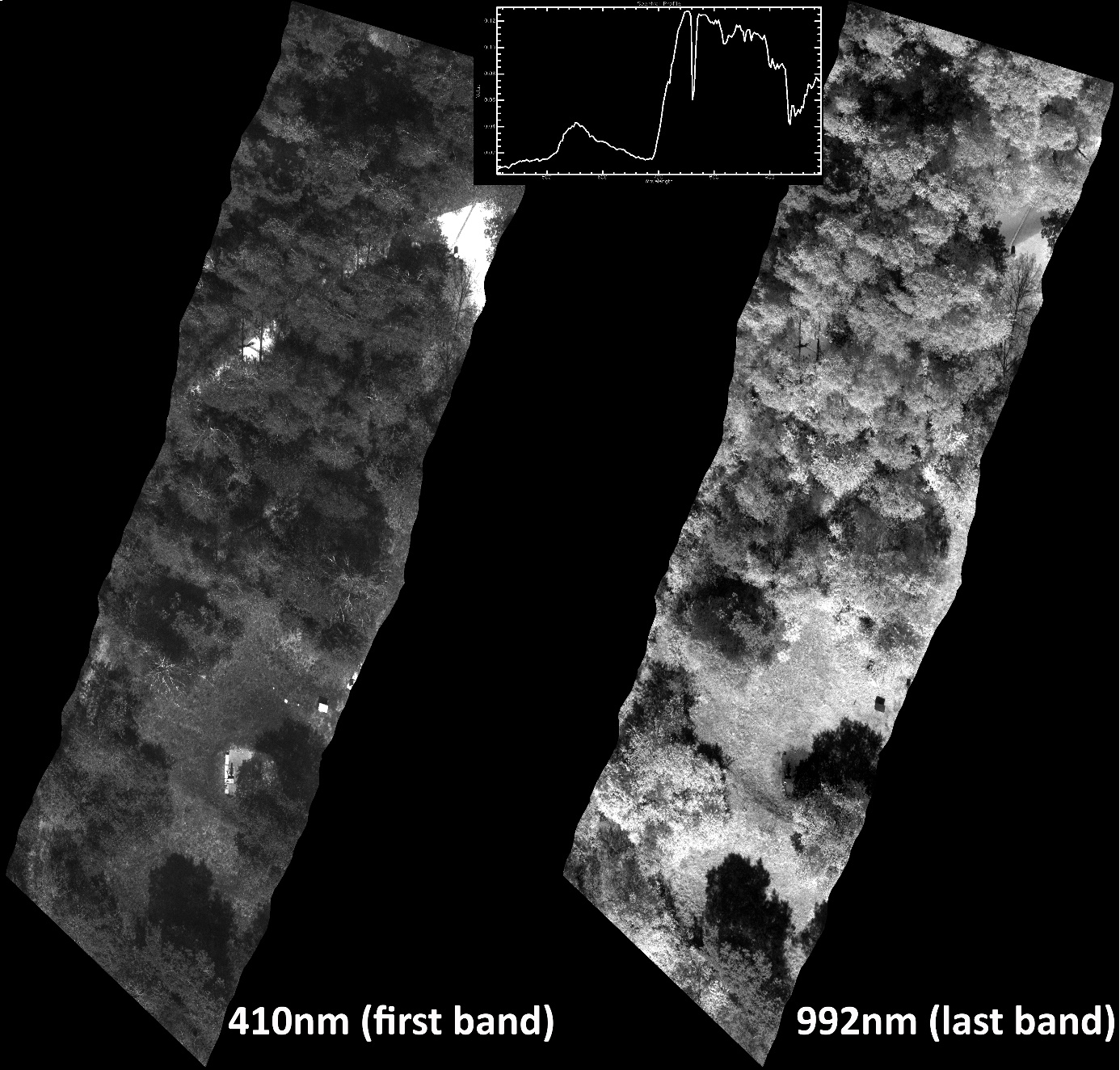 To obtain really useful information, the SNR curve needs to be specified for a given input radiance and a given (and operationally realistic) integration time. This information should be part of any test report for any system. A poorly designed system can be specified for the full range 400-1000nm, and have a decent peak SNR in the middle of the spectral range, but still, be unusable for several tens of nanometers at the start and end of the spectral range. A qualitative assessment of the SNR characteristics can be done by viewing single-band images at the edges of the spectral range of the system, as shown in the figure below.