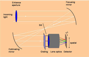 Briefly, the camera operates as follows: The camera fore optic images the scene onto a slit which only passes light from a narrow line in the scene. After collimation, a dispersive element (in our case a transmission grating) separates the different wavelengths, and the light is then focused onto a detector array. The net effect of the optics is that for each pixel interval along the line defined by the slit, a corresponding spectrum is projected on a column of detectors on the array. The data readout from the array thus contains a slice of a hyperspectral image, with spectral information in one direction and spatial (image) information in the other. By scanning over the scene, the HySpex camera collects slices from adjacent lines, forming a hyperspectral image or "cube", with two spatial dimensions and one spectral dimension. Note that the scanning is often intrinsic to the application: In remote sensing, scanning is provided by aircraft or satellite movement. Also, in many industrial quality control applications, products conveniently pass the sensor on their conveyor belt.