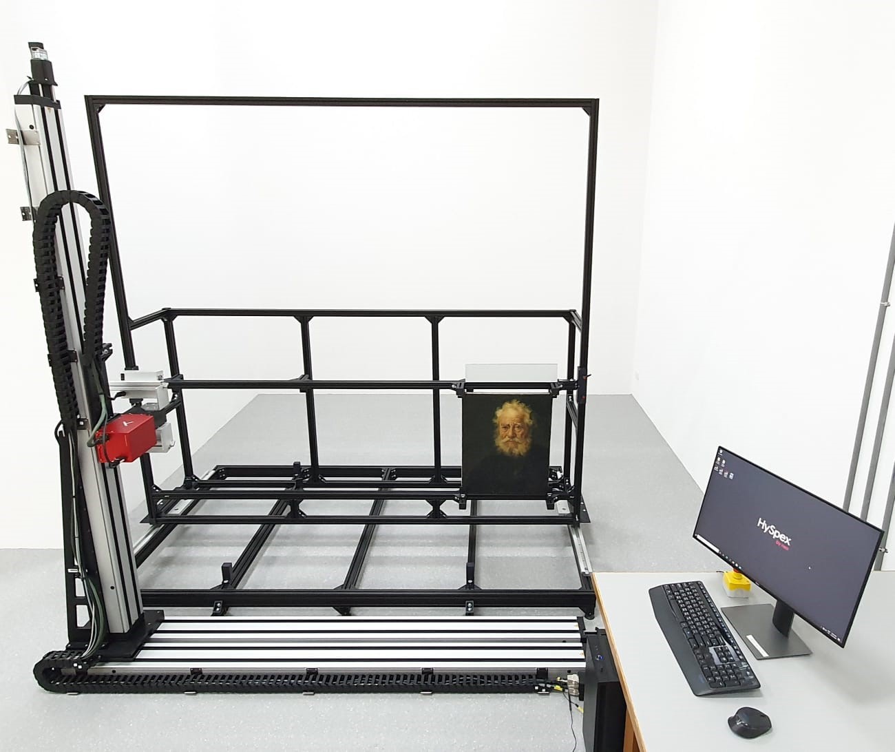 The system used by C2RMF is based on NEO’s well proven HySpex VNIR-1600 combined with a large (100cm*150cm) horizontal and vertical scanning stage, a fiber optic light source and a high resolution line scan camera yielding a scene pixel size of approximately 12μm at 30cm object distance. The setup is compatible with all HySpex cameras and can be delivered in both multi- and single-camera configurations to cover the desired spectral range.