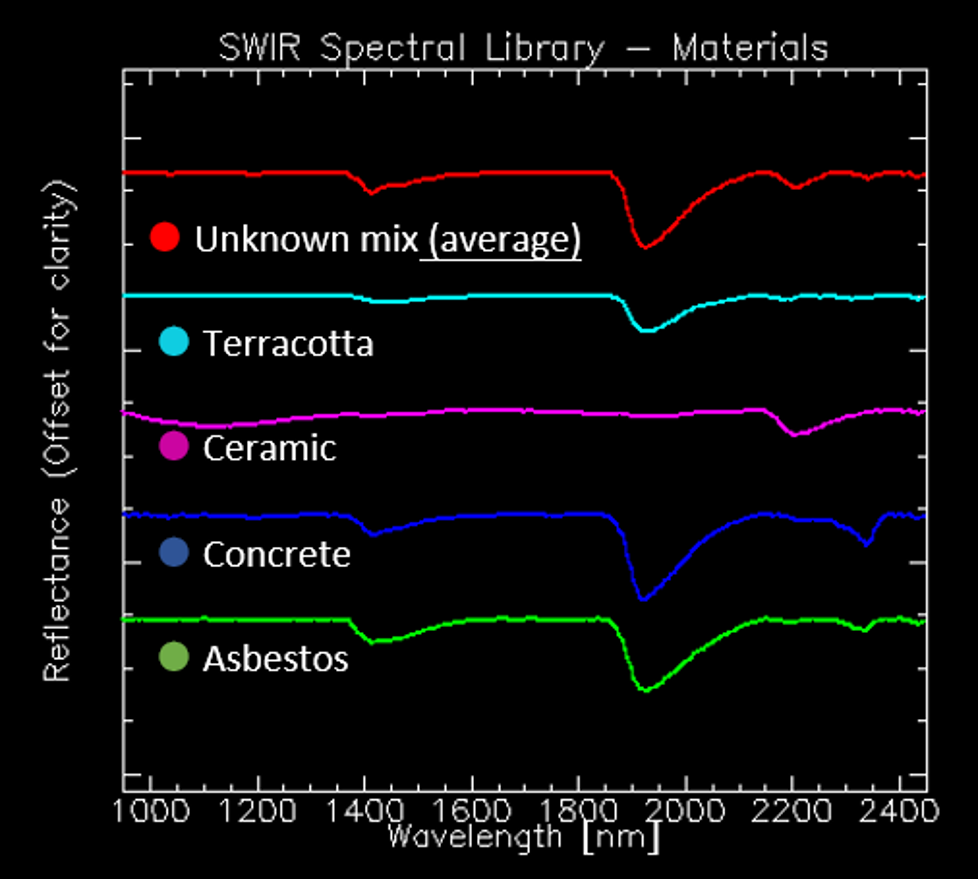 Although the SWIR reflectance spectra of the five different classes look similar, the different materials all have spectral features that are unique enough to separate them from each other and to create a robust classification model. All pieces of asbestos, concrete, ceramic, and terracotta were correctly assigned to their classes – even the smallest ones. The rubble pieces were of varying type and hence not given their own class. The majority were correctly detected as no class but some were identified as part of one of the other classes. This could be either false positives or misidentification during the preparation of the samples. If needed, the varying spectral properties of this group can be analyzed in detail and included in the model.