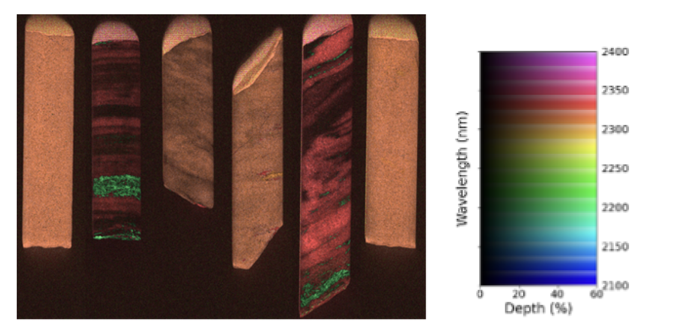 Figure 1 shows the different spectra for six of the provided drill cores. Mineralogic changes within each core are evidenced by the changes in the observed spectral features, as well as the variance of spectral features visible through the grey envelope. In Figure 2, the wavelength position of the absorption feature is modelled [2]. The strongest absorption feature position and depth is plotted. The dolomite feature minimum at around 2320nm is represented in orange colors, calcite with a minimum around 2340nm is shown in red, and clay-type mineralization around 2200nm is shown in green.