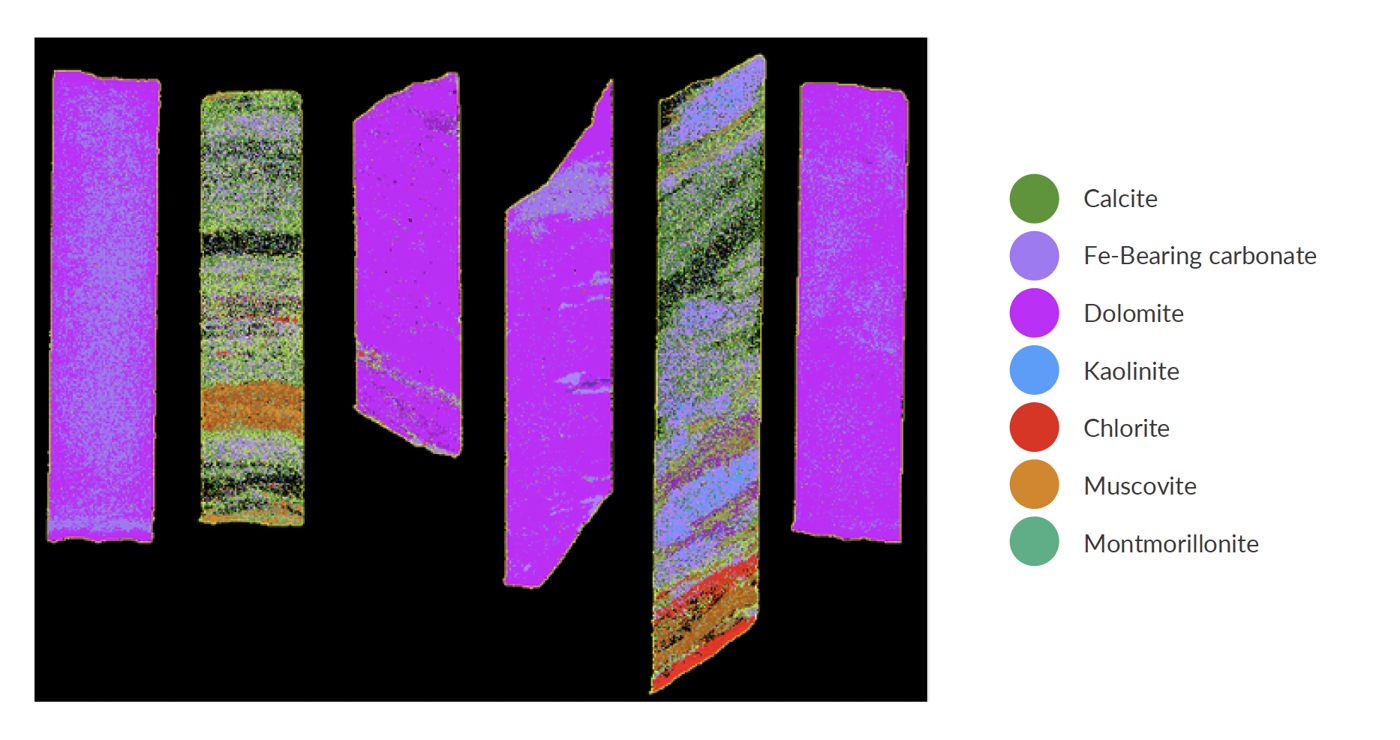 Figure 4. Dolomite and calcite dominated cores showing veins of montmorillonite, muscovite, and kaolinite mapped via publicly available USGS MICA algorithm implemented in Breeze-Geo.