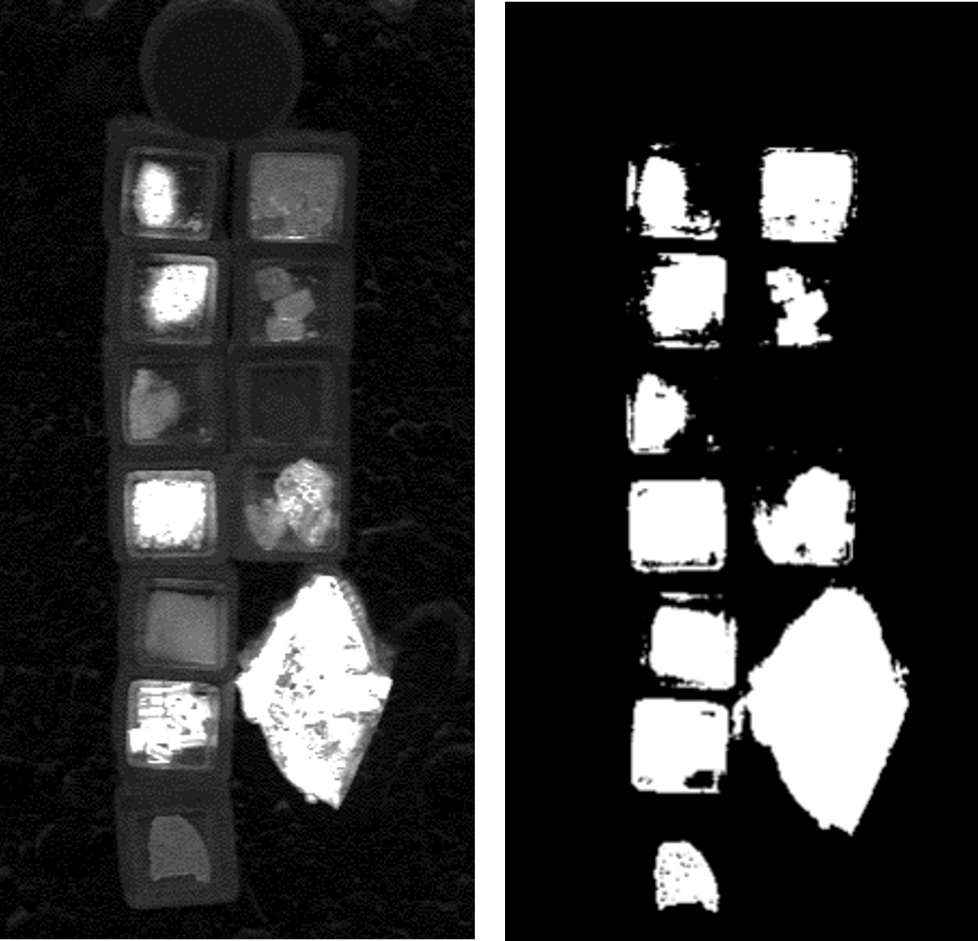 Anomaly detection and segmentation. The anomaly plot (left) shows how well the different types of explosives can be separated from the background – soil, in this case. In the image to the right, a threshold value is selected to segment the image. All pixels below the threshold are colored black and all pixels above the threshold are colored white. All the samples representing different types of explosives can be clearly separated from the background, the only exception in this example being the Unknown sample 1.