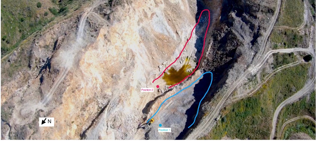 Figure 4: Position of the two mine face scans within the Bajoca open pit. Position 1 in blue and position 2 in red. Dots show the position of the HySpex camera, the line shows the area that is represented within the rotational scanlines.