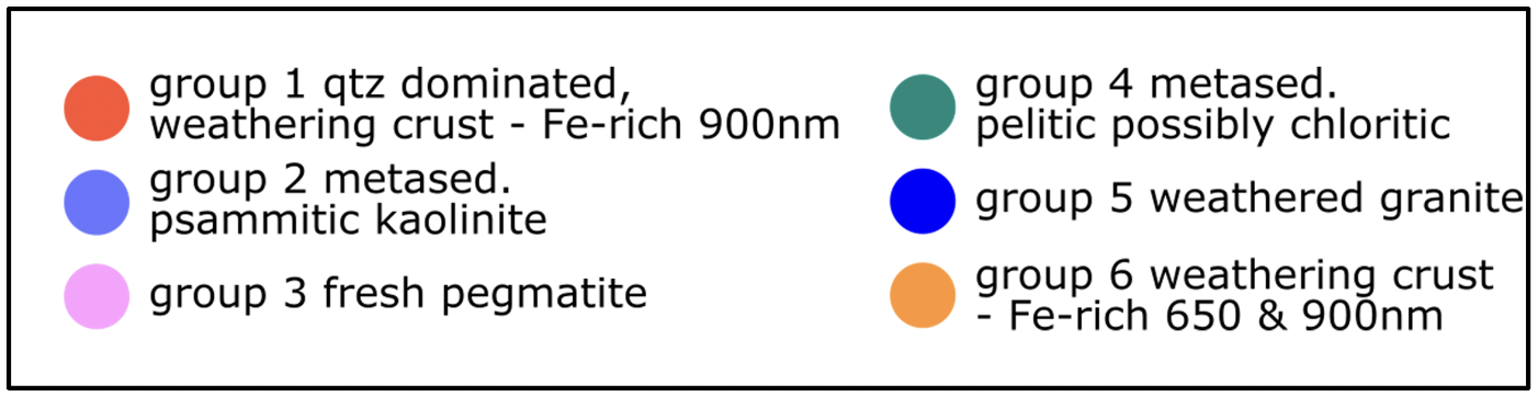 Figure 1 shows the samples and spectra library grouped into different geochemical groups relevant for the area – the spectra groups were built according to the expected rocks in the area and lithological mapping [2,3].