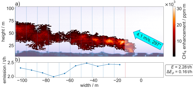 Using a matched-filter algorithm, methane plumes above the facility were identified. By combining this information with wind data, Knapp et al. were able to estimate emission rates, see Figure 2 for an example. The captured data reveals significant variability in methane emissions on timescales ranging from minutes to days. This technique complements observations from aircraft and satellites, which cannot capture source variability at such short intervals. It also complements other leak detection methods, such as OGI (optical gas imaging) and thermal infrared spectrometry. The presented setup enhances state-of-the-art emission monitoring by remotely measuring the dynamic emissions of localized sources with a minute-by-minute resolution. By harnessing cutting-edge technology and capturing emission dynamics, we move closer to a comprehensive understanding of methane's role in climate change and the implementation of effective mitigation strategies.