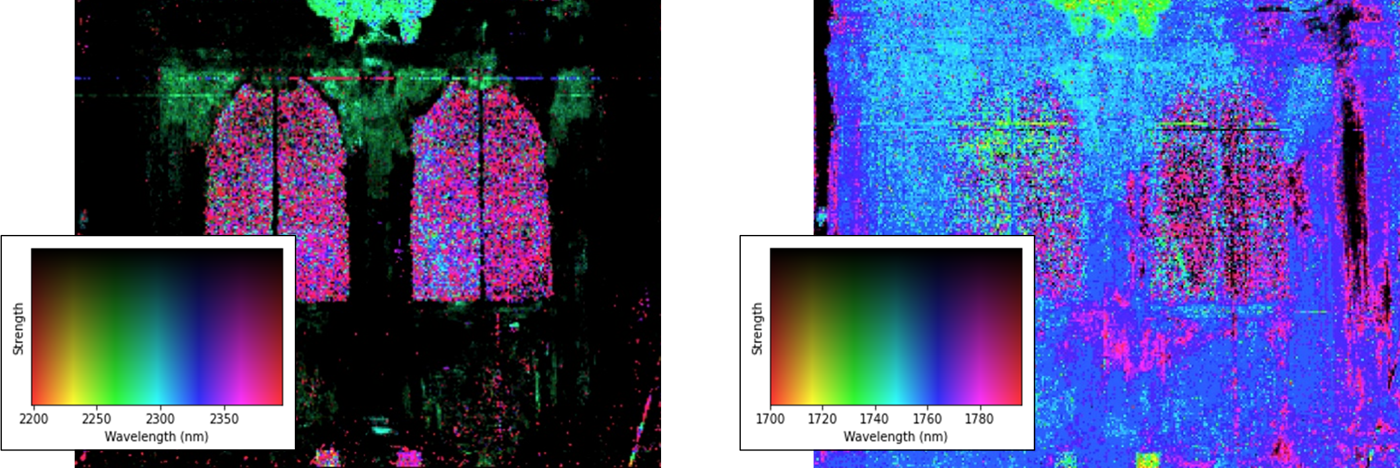 Spatial distribution maps for minerals, mineral groups and moisture can be generated by isolating the respective, known absorption features and calculating their absorption band position and depth. Two different minerals are mapped in Figure 4. Calcite with an absorption feature around 2320-2340nm and gypsum with its diagnostic feature around 1751nm, 2200nm and 2270nm. The carbonate absorption feature was calculated over a larger spectral range (2200-2400nm) as lime stucco may contain gypsum, aggregates and other binders in addition to carbonate components causing a shift in absorption feature position.