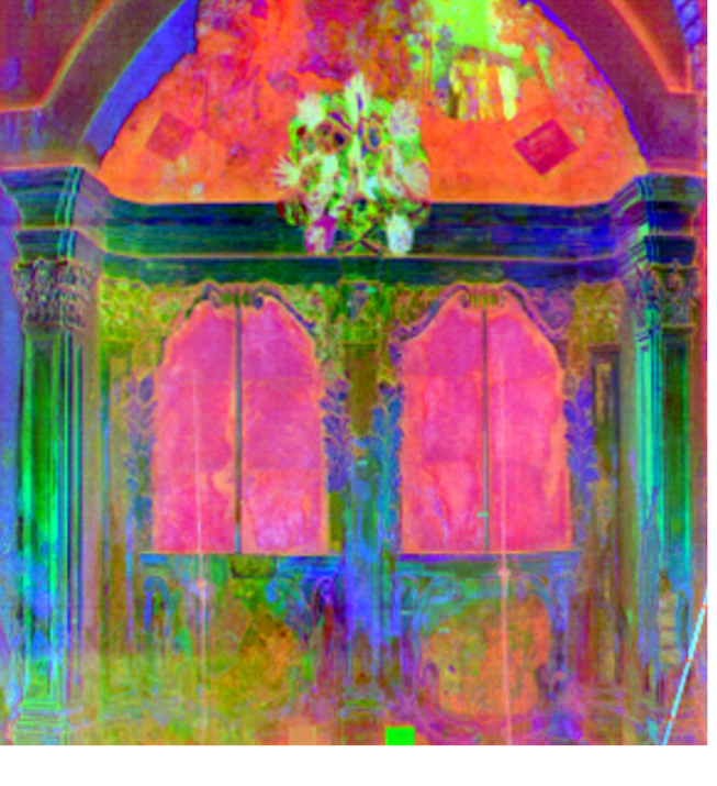 Initial information about the spectral differences of the building materials is provided by a principal component analysis (PCA). Fig. 3 shows the result as a color composite of the main components R: 1, G: 5 and B: 8 in the near to short wavelength infrared based on the co-registered HySpex data set. Identical colors within the image represent spectrally homogeneous surfaces. The high spectral variance of the stucco ornaments is particularly striking here. During the conservation measures between 1983 and 1985, the lime stucco ornamentation was restored, and the outcroppings were largely supplemented by hand.3 Presumably, these differ spectrally from the original lime stucco.