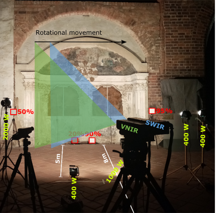 The epitaph was scanned using cameras from the HySpex Classic and Mjolnir series operating in the VNIR (400-1000nm) and SWIR (970-2500nm) spectral regions with a spectral sampling of 3.3nm and 5.5nm, respectively. They were operated from a motorized moving stage, scanning line-by-line in a rotational manner (Fig. 2). Five construction spotlights totaling 5200W were distributed over the entire length of the site at a distance of 5m. Four gray reference plates of different reflectivity values were placed in the scene for reflectance retrieval. Distinguishable materials on the surface were also sampled with a point spectrometer and compiled into a reference spectral library. More details on the scanning and correction of the illumination can be found in Köllner et al, 20211. The data analysis was performed by the GFZ hyperspectral geology group around Nicole Köllner in cooperation with the University of Applied Science Potsdam in the Department of Conservation and Restoration.
