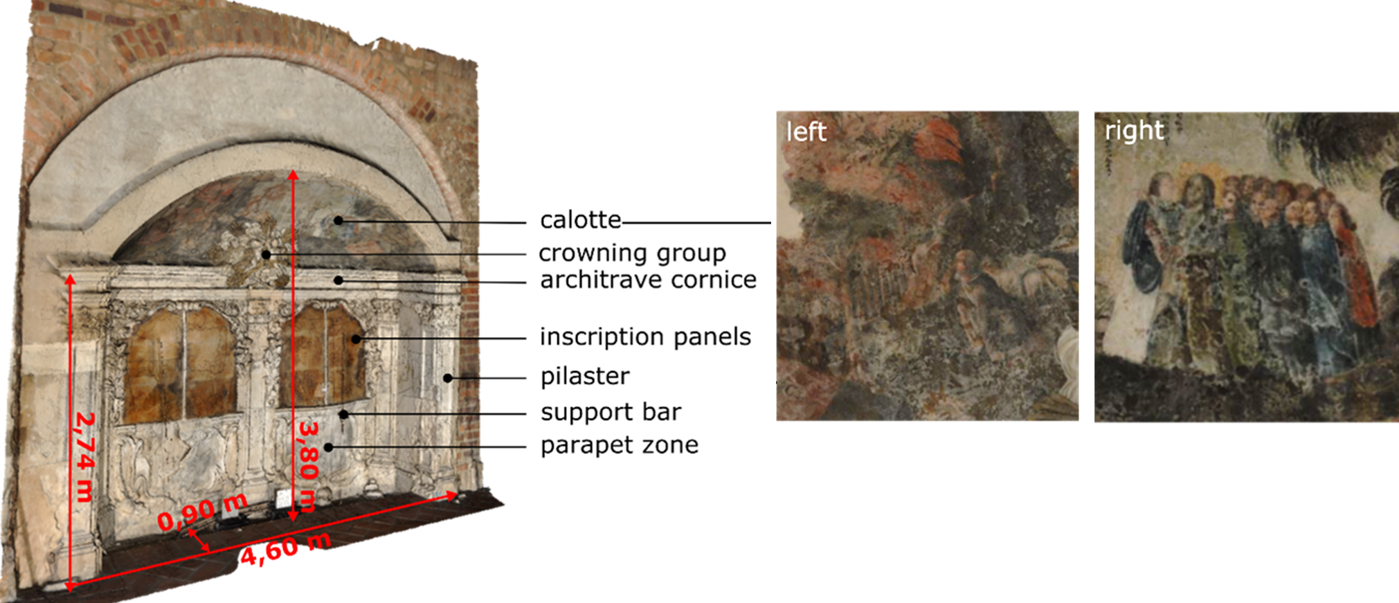 The different elements of the burial site are shown in Figure 1. It contains inscription panels framed in fine stucco decoration. The sides are lined by pilasters with Corinthian capitals and the parapet zone below the panels is decorated with stucco motifs of transience such as skulls and bones. Above the pilasters sits a stuccoed crowning group with angels, hourglass and a skull, topped by a calotte with an 18th century mural painting depicting biblical scenes.
