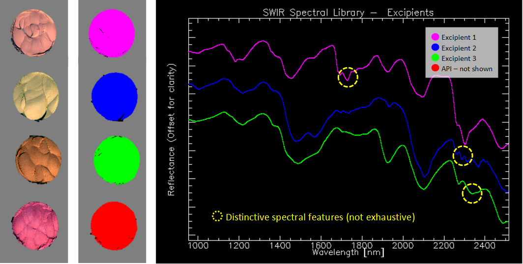 Although all the substances appear identical in the visible range, they all show spectral structure in the SWIR spectral region. The API signature is particularly easy to distinguish due to its unique absorption features. The spectral differences between the pharmaceutical excipients are smaller, as expected from components with similar chemical structure.