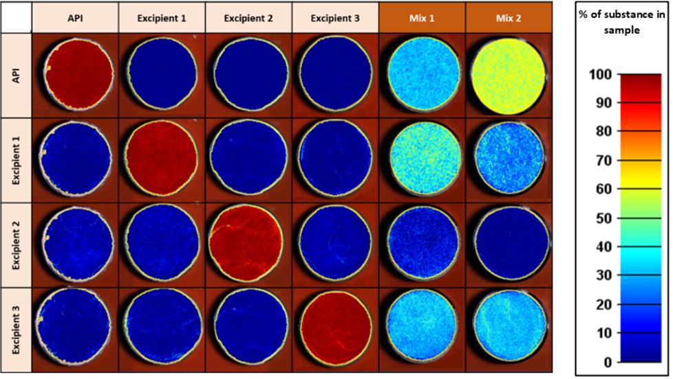 Hyperspectral imaging is a powerful tool to detect the concentration and distribution of different chemical components in mixes. In pharmaceutical tablets, there are typically one or more active ingredients (API) mixed with several pharmaceutical excipients including fillers, binders, disintegrants, lubricants, glidants, flavours and colors. Detailed control of the mixing ratios is critical not only to secure correct API dosage, but also for correct delivery and absorptivity in the body. It is also critical to achieve homogenous mixing of the components to secure that all tablets in a production are the same. For tablets that are produced with the purpose of being split in two or four, there is even a requirement for homogeneity within tablets.