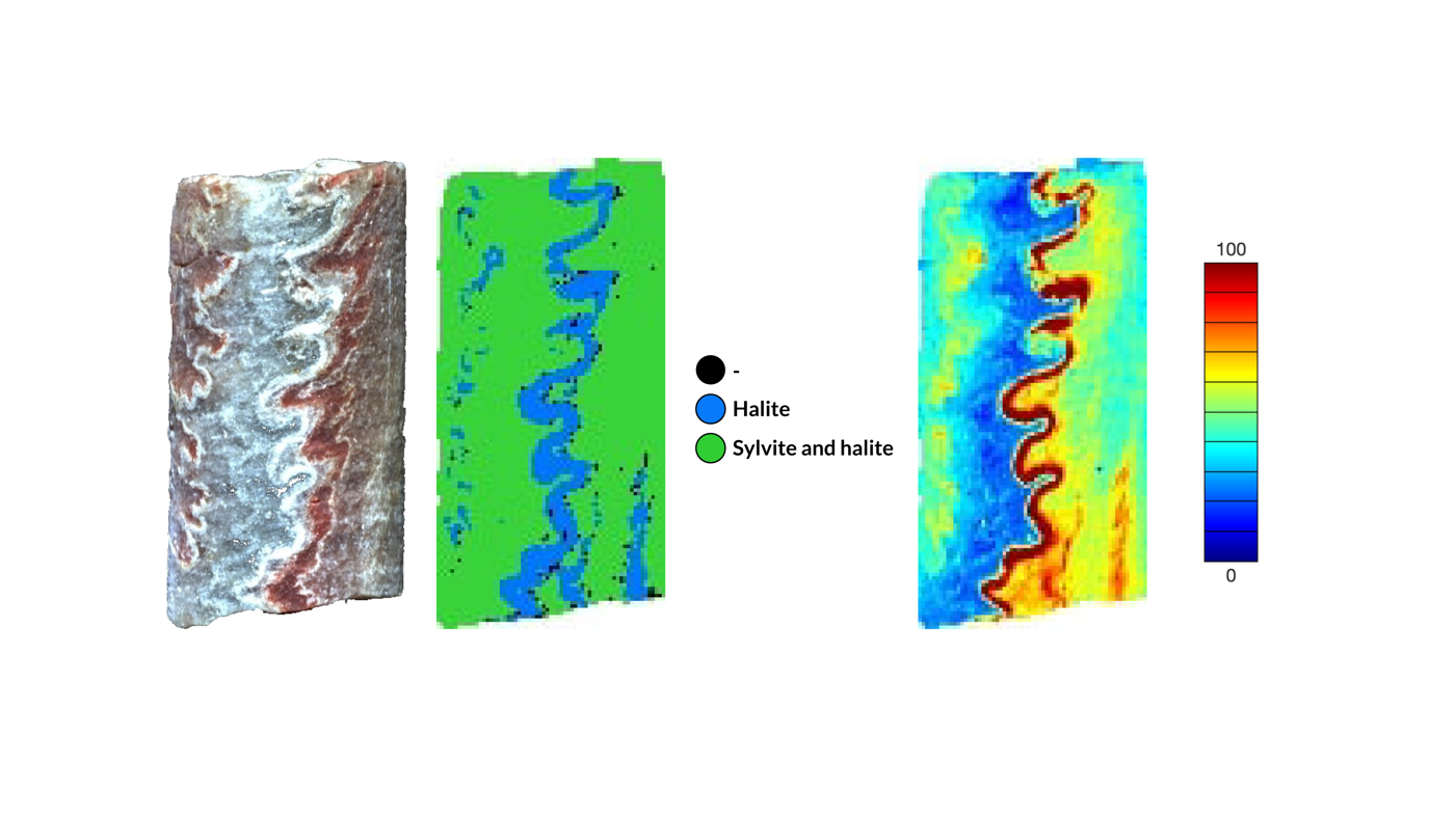 Figure 4: Left: VNIR, true colour RGB: Centre and right: SWIR analysis based on a sample representing sylvite-halite. Centre: SWIR-based classification of Lithologies. Black pixels represent unclassified pixels; Right: SWIR-based KCI% content prediction per pixel.