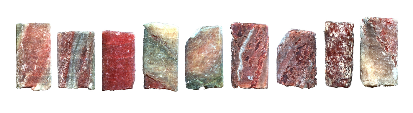 In this project, sylvinite rock is the main KCl source. Here, the mineral sylvite co-exists intimately with halite and carnallite (Figure 2). Of the 113 samples, 83 represent the sylvite-halite category (sylvinite), whereas 17 represented halite and 13 carnallite-halite lithologies. The samples are not mono-mineralic and the samples’ lithology label is provided by the operators on site, including the determined KCl, MgCl2 and Ca2+ grades.