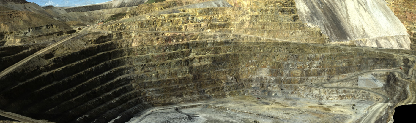 Figure 1: Top: True color image of the co-registered HySpex VNIR-SWIR dataset collected in Cresson Pit in 2017 by the USGS2. The open pit is ca. 1km across. Bottom: USGS Material Identification and Classification Algorithm (MICA) surface mineral analysis showing the areas dominated by white mica (orange). Areas covered by leach pads or dump piles, areas in shadow, and areas with low signal to noise, are manually masked out from the classified pixels.